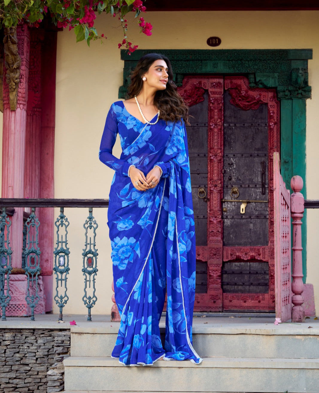 Trending Chiffon Floral Print Pearl Lace Border Saree